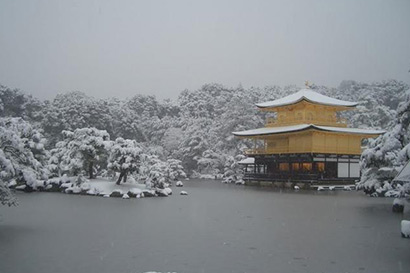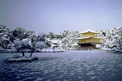 冬日,在漫天飞雪下的金阁寺显得更加金碧辉煌。