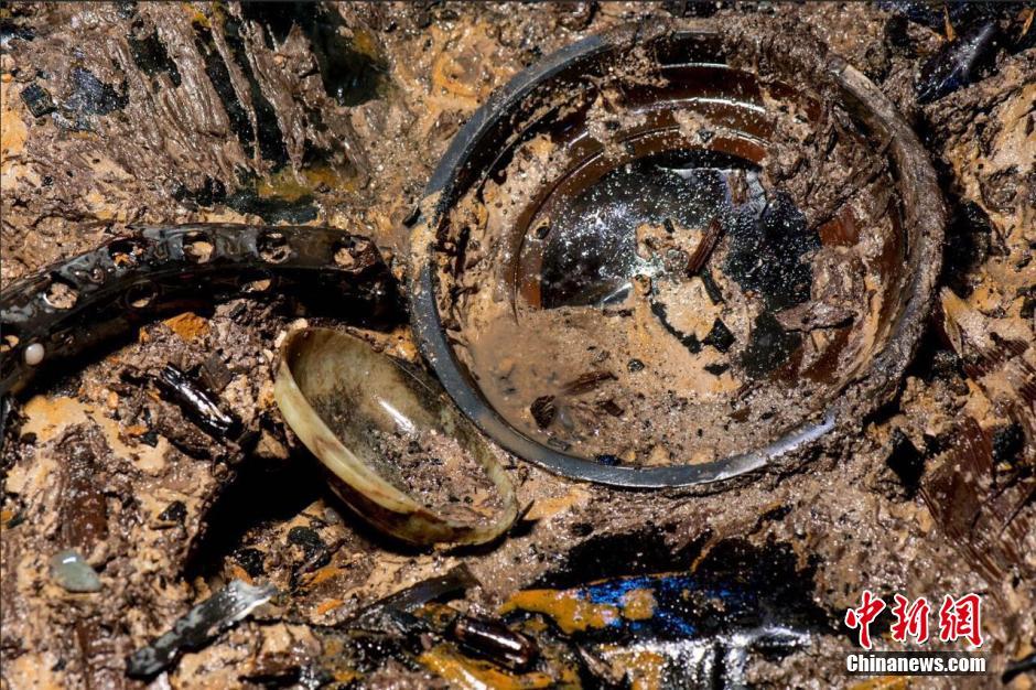 主椁室南侧清理出的一件玉耳杯。耳杯常被认为是一种酒具,其实它也有装食物的功能。这次出土的玉耳杯是酒具,截至目前,西汉海昏侯墓已发现三种材质的耳杯,绝大多数为漆木器。