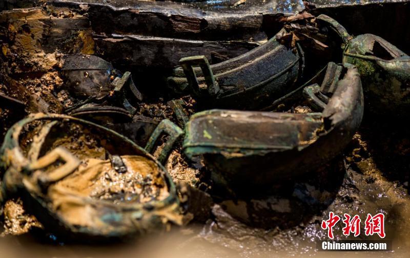 15日上午,新华社记者在现场看到,考古人员正在清理主棺上面的木板,但进展非常缓慢。在主棺上方,考古队员发现了三把金丝缠绕的玉具剑,制作工艺精湛,金丝缠绕的部分为剑鞘。