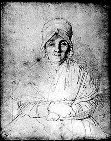 1814年安格尔的母亲安妮去罗马探望他时,安格尔为母亲画了这幅肖像。安格尔希望母亲看上去像能从画布上走下来,肖像充满了传神逼真的特色,母亲对儿子的爱和儿子对母亲的爱,都交融在画面里。