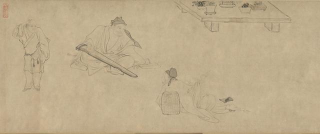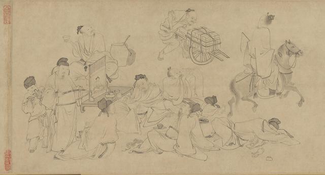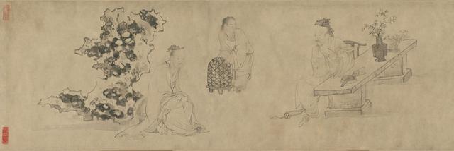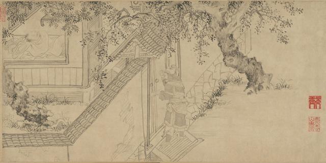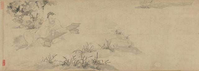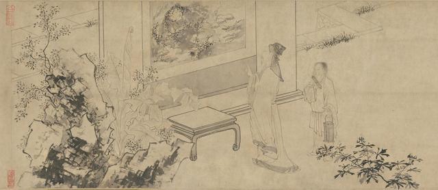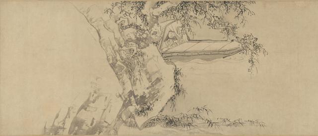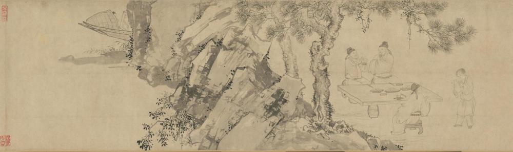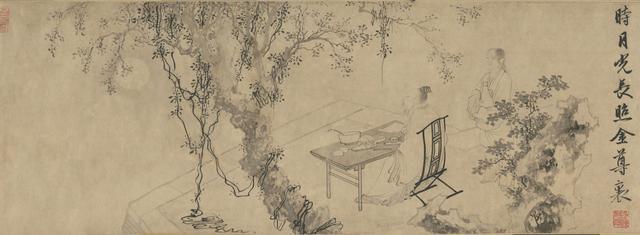 图中人物用白描法,笔法细劲透逸,形象生动有神。树石、藤草、桌椅、车、马、小舟等点景穿插有致。墨色淡雅,但淡而不薄,雅而不空。