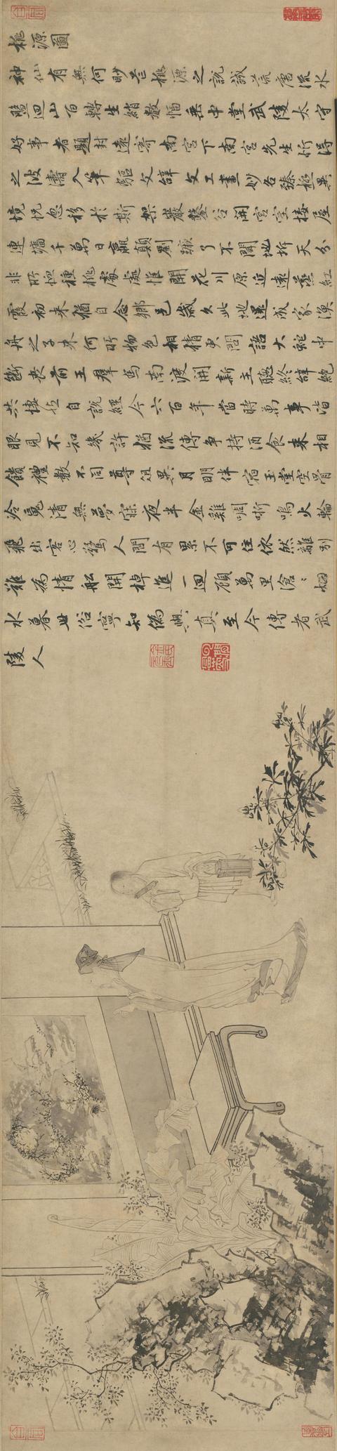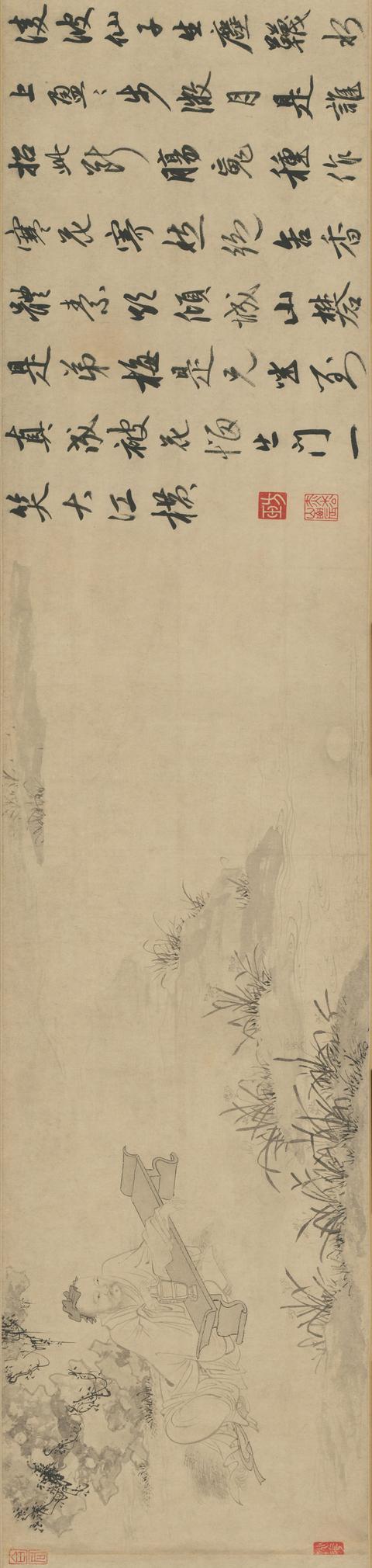 杜堇,明代画家,原姓陆,字惧男,号柽居、古狂、青霞亭长等,丹徒 (今江苏镇江) 人,古籍燕京 (今北京)。成化中试进士不第,遂绝意进取。工诗文,善绘事,以人物画著称,精白描法。唐寅 30 岁左右与杜堇相识,甚受其影响。