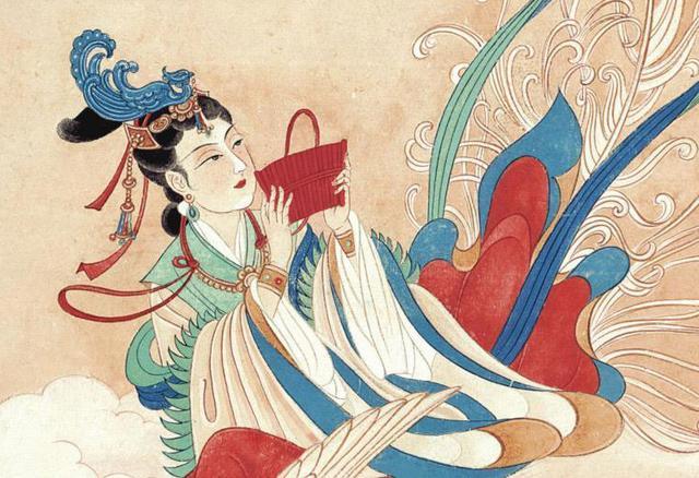 萧史乃秦穆公时人,善吹箫,穆公以女弄玉许之,遂教弄玉作鸾凤之响,其箫声似凤声。穆公作凤台,夫妻止其上。一旦,两人皆随凤凰飞去。秦人留“凤女祠”于陕西雍地祀之。故画中人应为跨凤吹箫之弄玉。
