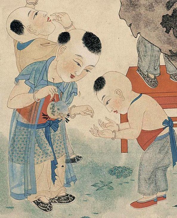 画面多是儿童作玩耍姿态,生动有趣,呈现出热闹欢乐的喜庆气氛。而石榴在传统的吉祥图案中象征着“多子多福”。在这幅画中,儿童与石榴都寓意着“多子”。