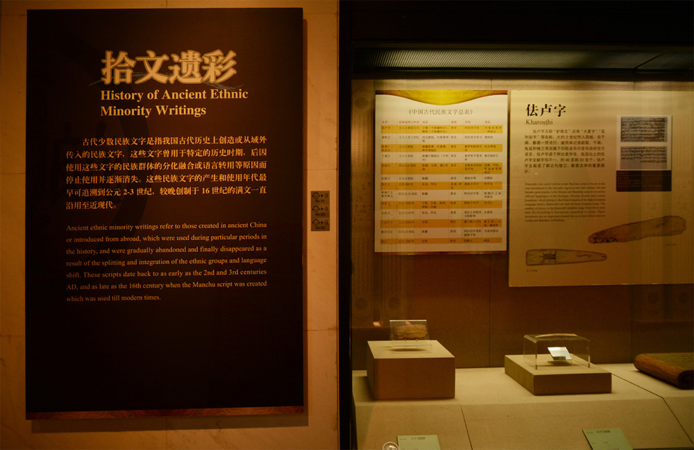 中国文字发展史第四展厅 我国55个少数民族中,有20多个民族不同程度的使用本民族文字,在现行民族文字中,蒙古族、藏族、维吾尔族等民族使用历史上形成的传统民族文字,这些文字的文献和文物为我们了解我国古代社会制度和社会生活提供了宝贵资料。本展厅主要介绍我国少数民族的文字及发展。