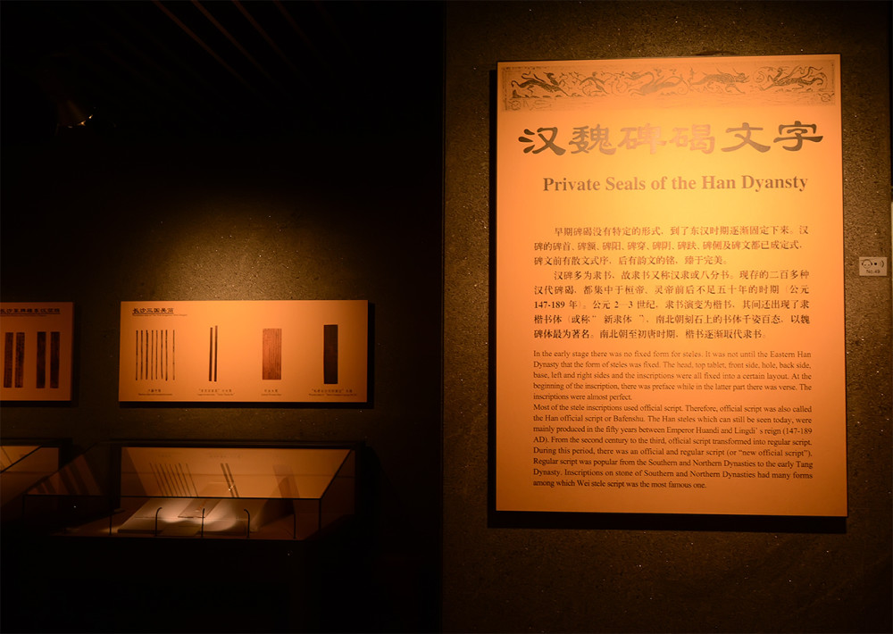 中国文字发展史第三展厅 隶书,以其实用性强,易于书写的特点,在汉代取代了小篆的地位,成为主要字体。两汉四百余年间,书法由隶分变为章草、楷书、行书。书体的不断变化使汉字书法艺术不断发展,给中国传统文化注入了鲜活的灵气与勃勃生机。本展厅主要介绍隶书的发展及演变。
