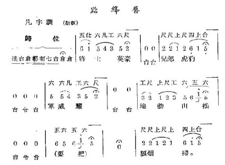 在现代京剧中,《点绛唇》又通称为“点将”,用于元帅升帐、江湖豪客的排山等,其作用是为了表现场面的宏大和增强气氛。