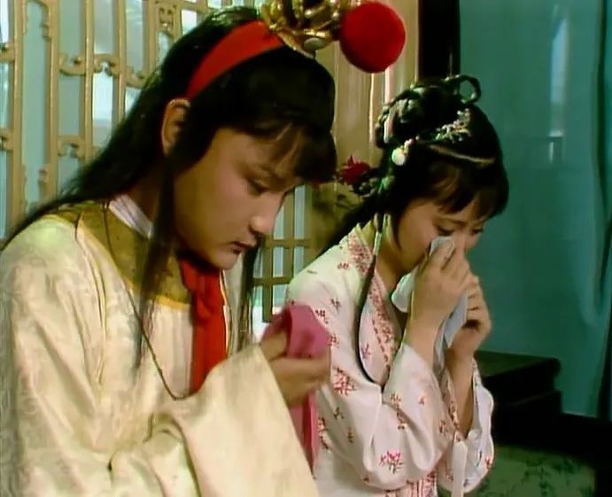纱衫。这是夏季描写中出现频次很高的一种服饰。上次我们说端午时说到清虚观打醮,宝黛二人闹矛盾有了口角,黛玉哭了,宝玉也哭了,宝玉哭时用袖子抹眼泪,黛玉虽哭着,却一眼看见了宝玉穿着簇新藕合纱衫,竟用袖子去拭泪,便一面自己拭着泪,一面回身将枕边搭的一方绡帕拿起来向宝玉怀里一摔,一语不发,仍掩面自泣。这里的宝玉穿的就是纱衫。之后的描写中,宝玉还穿过不同颜色的纱衫。银红色纱衫,出现在宝玉午睡,袭人在床前守着一遍绣肚兜一边为其赶蚊蝇的场景中。