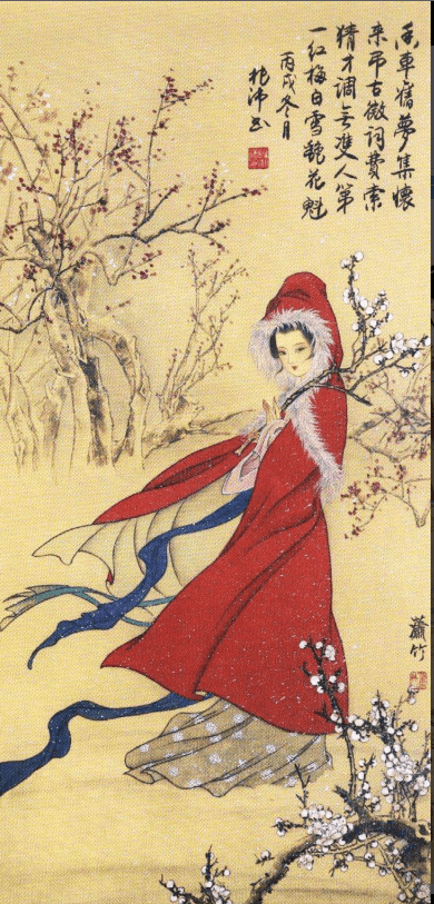 一看四面粉妆银砌,忽见宝琴披着凫靥裘站在山坡上遥等,身后一个丫鬟抱着一瓶红梅。贾母喜的忙笑道:“你们瞧,这山坡上配上他的这个人品,又是这件衣裳,后头又是这梅花,象个什么?”众人都笑道:“就象老太太屋里挂的仇十洲画的《双艳图》。”贾母摇头笑道:“那画的那里有这件衣裳?人也不能这样好!”