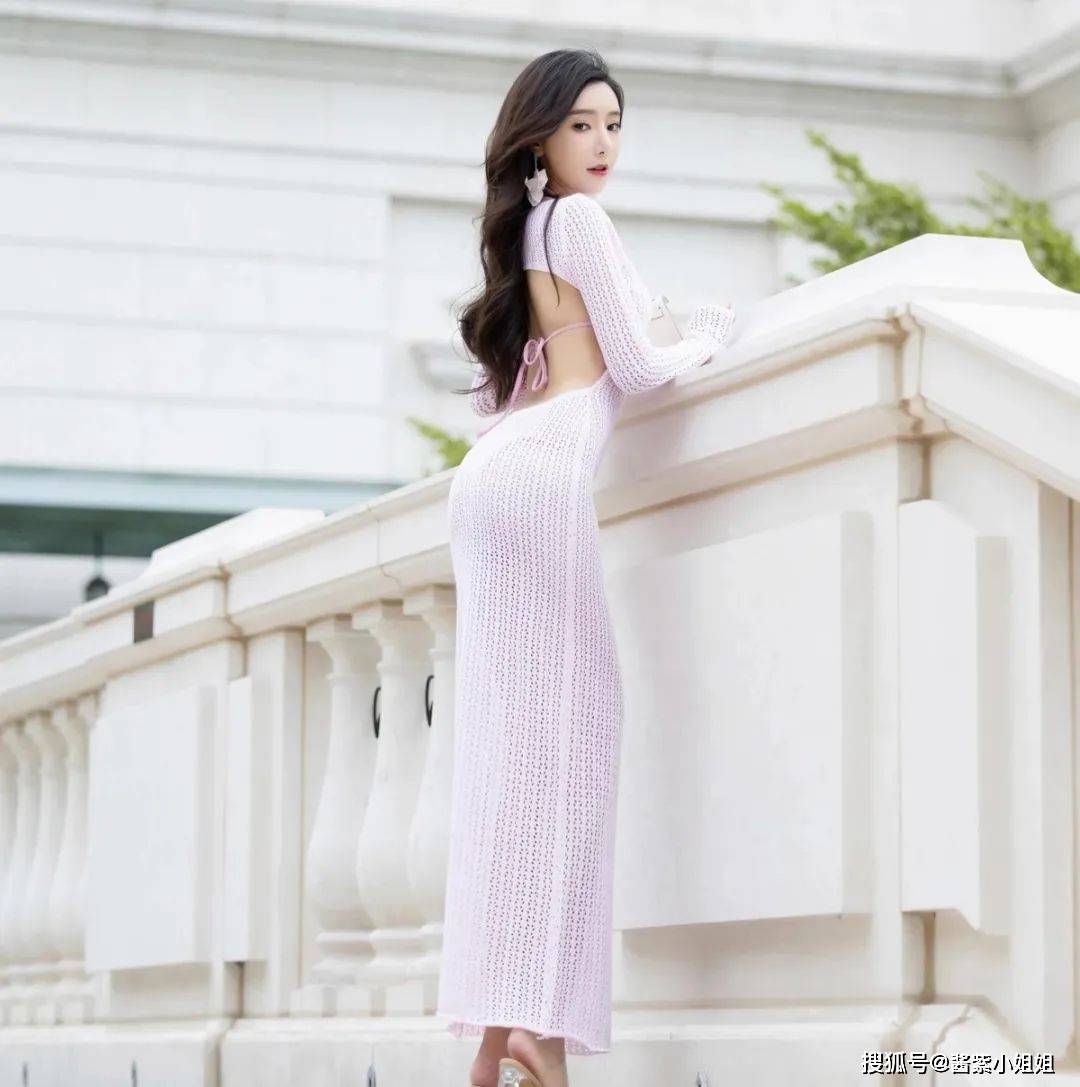 外搭的镂空紧身连衣裙,无疑是这套装扮的神来之笔,更是性感魅力的极致升华。它宛如一层若有若无的梦幻薄纱,以细腻精湛、巧夺天工的镂空工艺,编织出如蕾丝般繁复精美、令人叹为观止的花纹,似隐似现地笼罩在比基尼之外。那紧身的设计,如同她的第二层肌肤,紧紧贴合着她身体的每一处起伏,将她的身材优势进一步放大到极致。每一寸肌肤的轮廓,每一处曲线的转折,都在这件连衣裙的衬托下显得更加凹凸有致、风情万种。不经意间,它流露出的那股神秘而魅惑的气息,仿佛是无形的磁石,让人的目光不由自主地被深深吸引,仿若陷入了一场迷离而绮丽的梦境,沉醉其中,难以自拔。