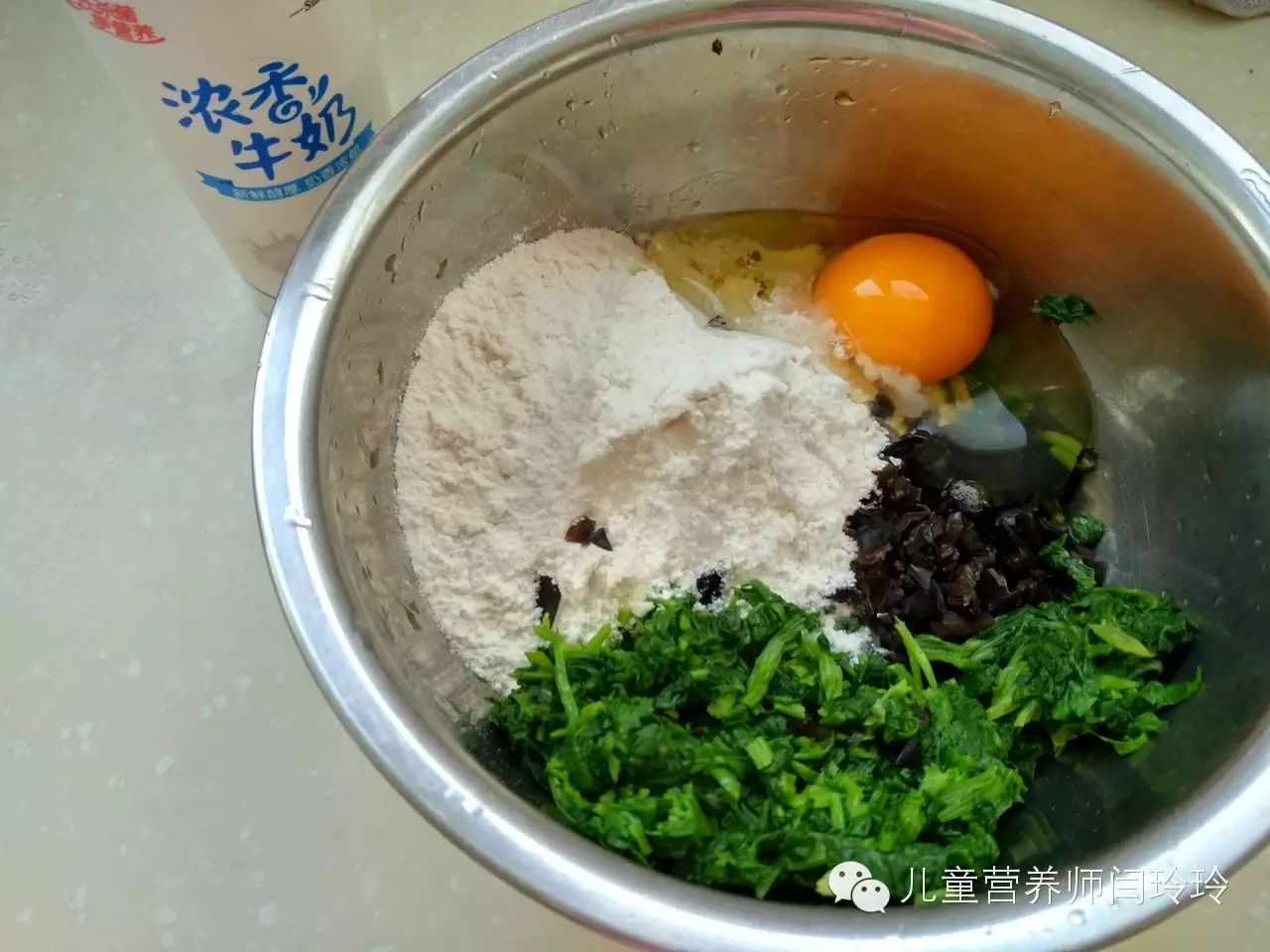 2、将面粉中加入鸡蛋、芹菜碎、木耳碎、少许姜末;