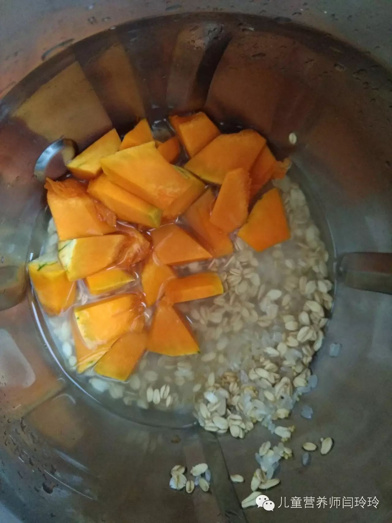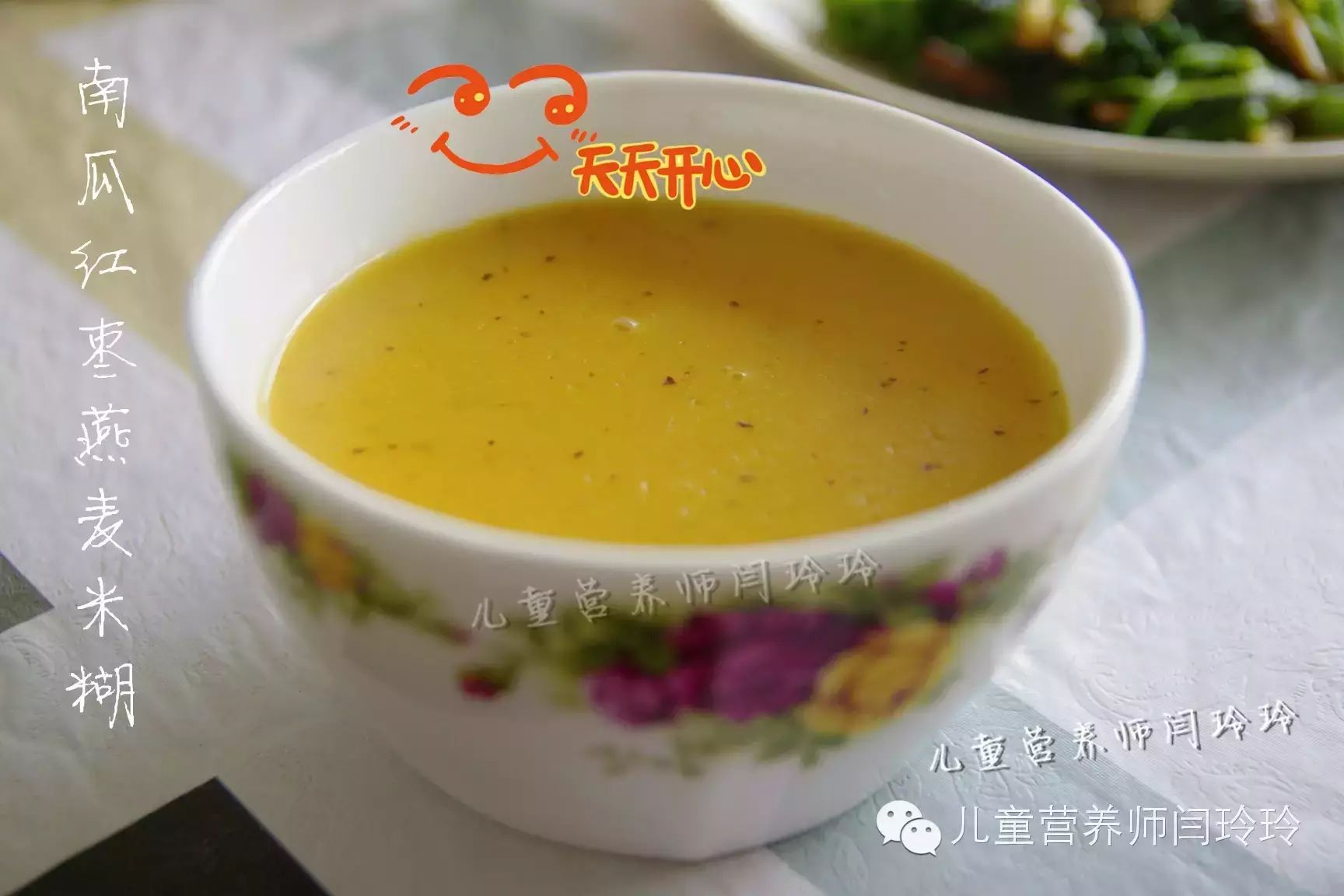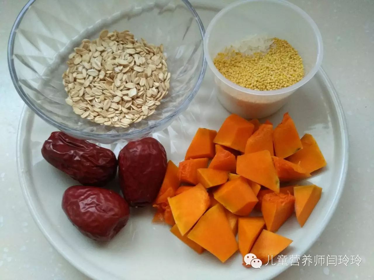 南瓜约50克,大、小米共约25克,红枣3、4颗,燕麦少许;