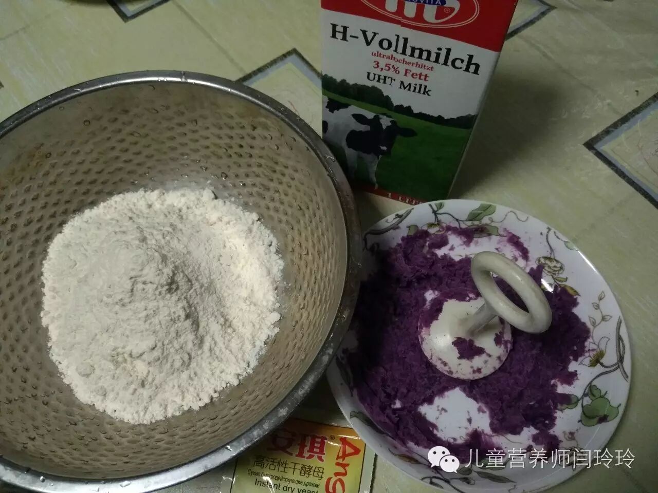紫薯80g、中筋面粉150g、牛奶200ml、酵母2-3g、糖15g;