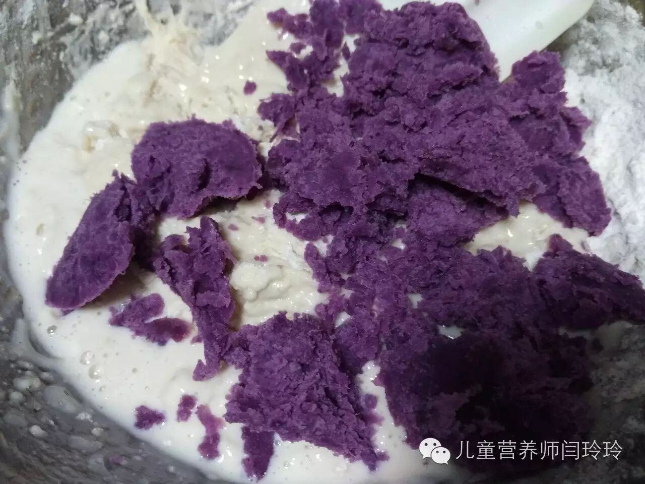 从营养价值看,紫薯也算是主食的一部分,富含膳食纤维、B族维生素、钾镁等矿物质,大大提高了面食的营养价值,对预防便秘、促消化都有帮助。经过发酵制作的薯类,更容易消化吸收,也比较符合宝贝消化能力;而且彩色的食物外观看起来也能吸引宝贝,促进食欲;