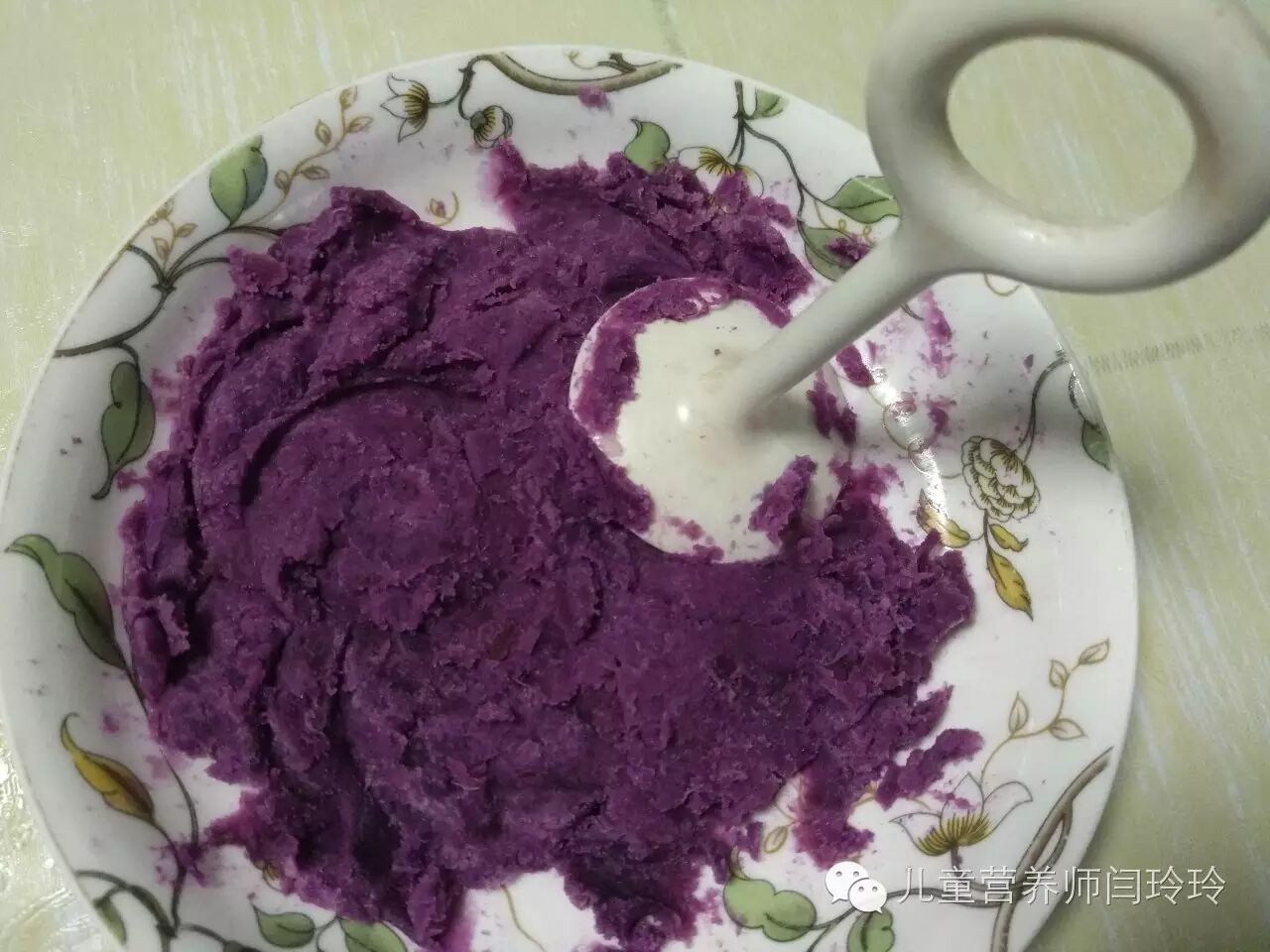 1、将紫薯蒸熟,放稍凉后,按压成泥;