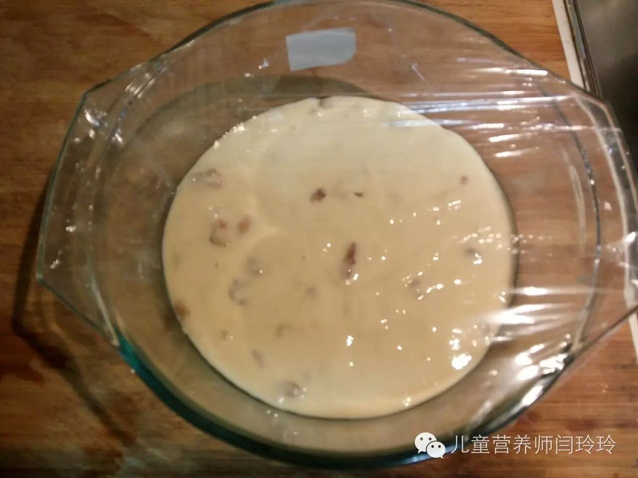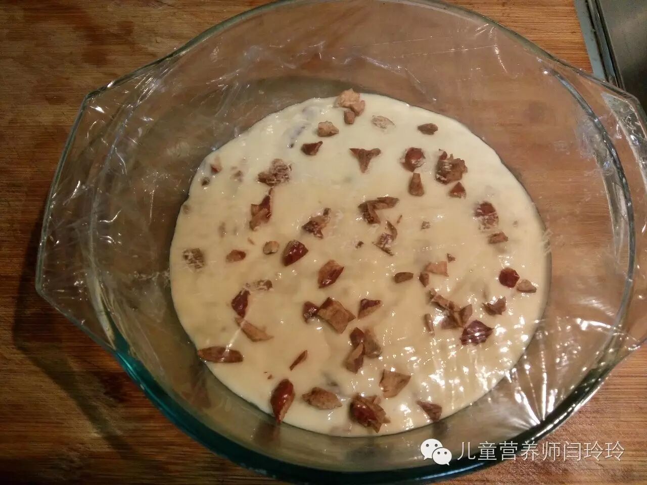 8、将面糊倒入刷好油的容器中,洒上剩下的红枣肉,盖上保鲜膜,二次发酵10分钟(10分钟就够了哦)!