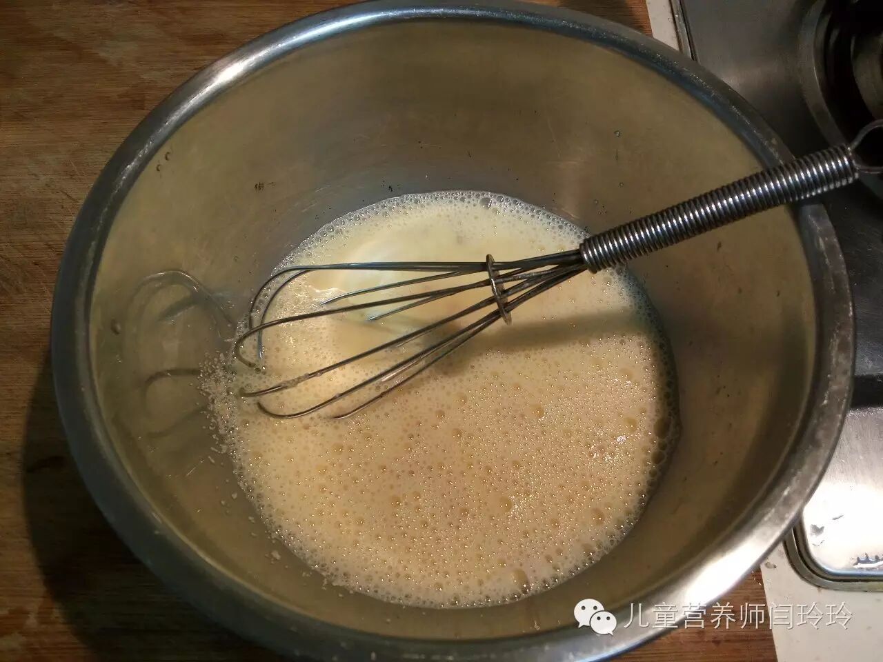 1、鸡蛋打散,加入牛奶、酵母、糖,混合搅拌。