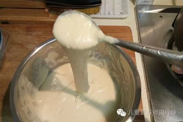 2、加入面粉搅拌均匀,面糊的状态,用勺子挑一勺起来可以缓缓的流下。