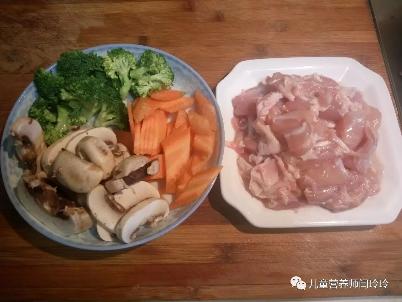 2、鸡腿肉切小块,其他食材洗净后,胡萝卜、蘑菇切片,西兰花掰成小朵;