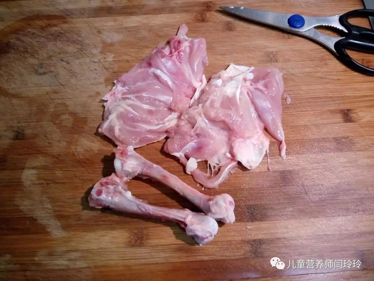 1、用剪刀将鸡腿剪开,取出鸡骨,去除筋膜部分;