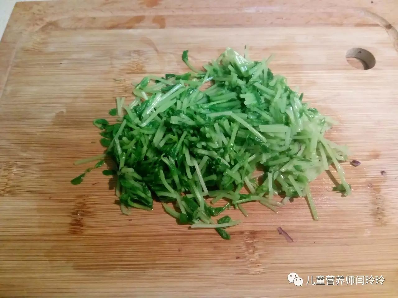 3、 将焯熟的豌豆苗切碎;