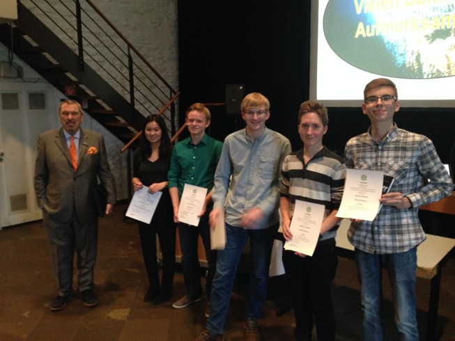 Tolan 博士,很少有女士拿到这个奖的,这个女孩很了不起。今年竞争这个奖项的题目是《泰坦尼克----跟着高端技术下沉》,所有参加竞赛的学生(20名)都得到了一本书,和一张证明,竞赛委员会的老师说,这张证明在今后求学找工的道路上意义重大。屠所在的学校EMA还得到了500欧元的奖励。屠的得奖题目是:Ausarbeitung