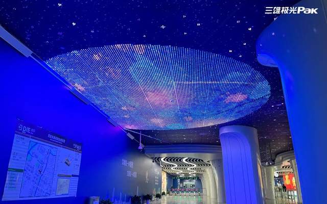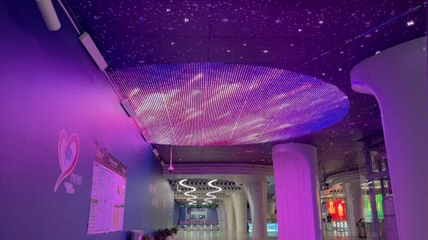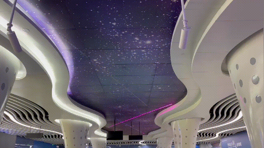 走进上下通道:对于上下班高峰期乘地铁的人来说,眼前的“见光不见灯”的设计真是太友好了。头顶上方智能变换的星点光源,将整个片区照亮,其点点灯光如同星星般闪烁,抓人眼球,让人仿佛置身于星空之下。如此沉浸式的公共艺术灯光空间,有效地缓解乘客疲劳和引导路人有序进出站。