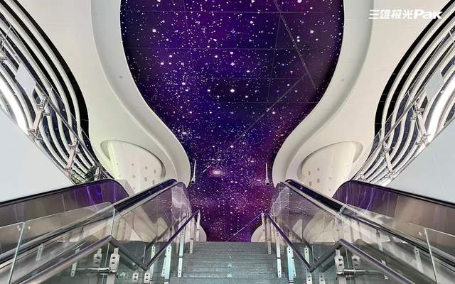 走进网红特色区:可以说,这里是许多旅客们必经的打卡点,灯光设计可谓未来感十足,同样采用智能控光技术,以光影演绎着星空下童话秘境,重新诠释天地、宇宙等元素,让人像身处科幻的电影场景中,超唯美的视觉冲击和光影变幻。