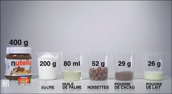 下面的图就更清楚了,所以你吃完一瓶Nutella就相当于吃掉一杯白糖、喝掉半杯油……