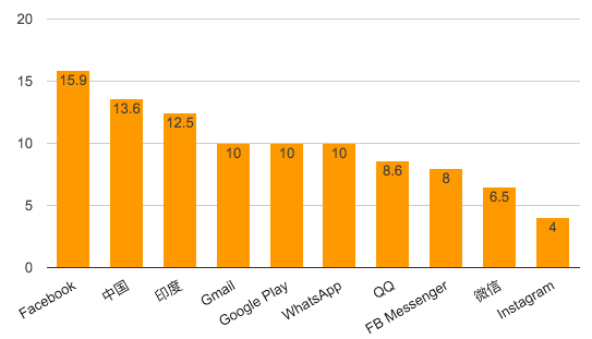除了 Google,全球最大的社交网络 Facebook 也有着惊人的用户量,其核心服务 Facebook 的月度活跃用户已经超过15.9亿——甚至多过了全球人口最多的国家中国。另外,Facebook 旗下的 WhatsApp、Facebook Messenger 和 Instagram 的活跃用户也均在4亿以上。