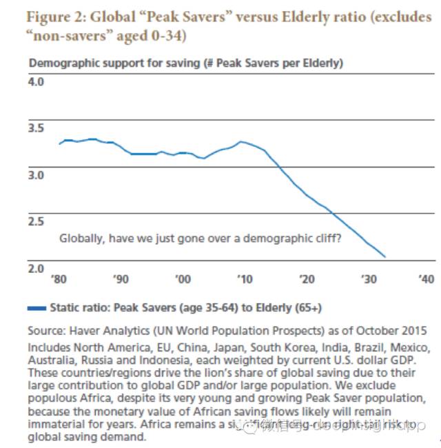 老龄化一个必然的结果是降低储蓄,推升利率。由于老年人失去了赚钱能力,相反是需要花钱的,他们会逐步抛售自己的存款和金融资产来养老,对应的应该是资产价格的长期下跌和利率的上涨。从储蓄的角度出发,我认为拥有最多储蓄的Peak