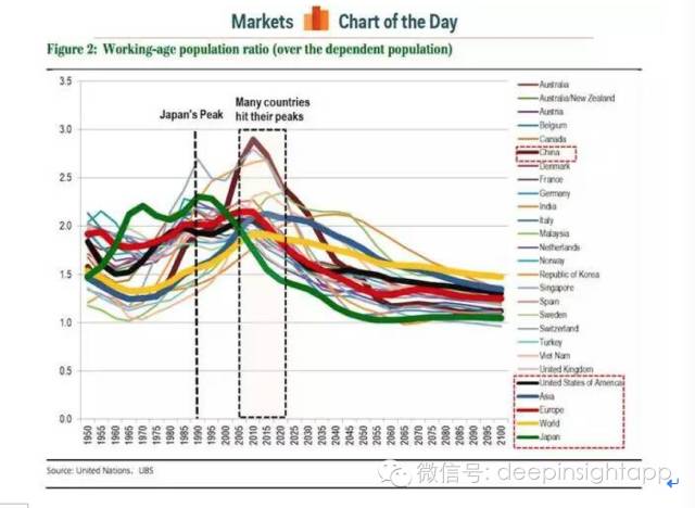 我们先来看一张图,根据联合国的统计,全球大部分国家将在2015--2020年之间出现就业人口的拐点。我们从下图中看到日本早在1990年就出现了人口结构的拐点,而中国,美国,欧洲,亚洲都将在这个阶段出现全面的人口拐点。这意味着什么?全世界的人口拐点也将在这个阶段出现。整个发达国家的年轻劳动力将成为非常稀缺的资源。而由于这些国家(包括中国)都不是真正的移民国家,美国在民粹主义上升后也会带移民政策收紧,这也会加剧劳动力人口缺失的问题。