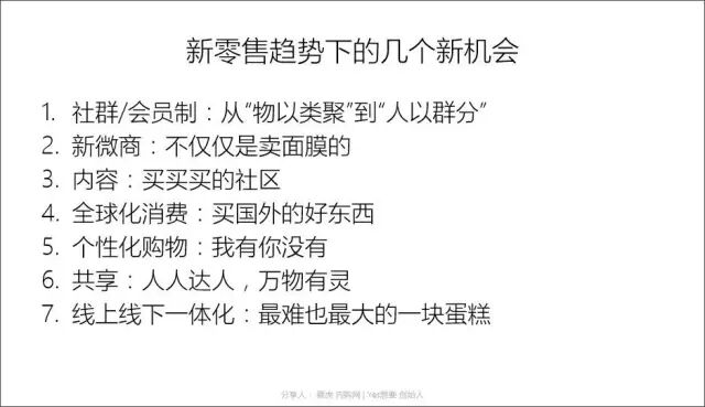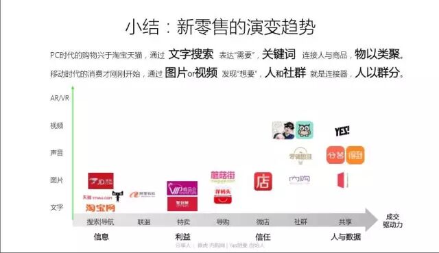 PC时代的购物兴于淘宝天猫,通过文字搜索,用户表达需要,通过关健词连接人与商品,物以类聚,在移动时代的消费才刚刚开始,更多用户通过图片视频发现自己想要什么,人和社群本身就是连接器,人以群分。而商品的表达方式正在从文字图片,演变到声音视频直播的时代,未来也许会融入到VR虚拟现实的场景中。我和大家分享一下,在这种新零售驱使下存在的几个机会: