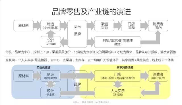 他们熟悉品牌,熟悉门店,熟悉用户,越来越多用户的购物决策依赖于他们的推荐,“人人买手”的时代正在到来,他们正在成为连接器,连接门店和消费者,连接消费者和品牌,甚至连接消费者和设计师;另一端是供应端,按需柔性生产(C2B)是必然的发展趋势,对于所有的制造型企业特别是个性化品类的制造型企业尤其重要。