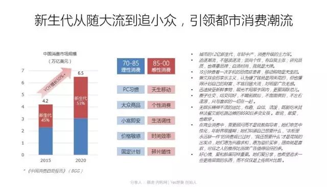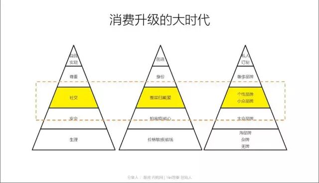 消费升级背景下,越来越多的年轻人需求,特别在一二线城市,已经升级到社交层面,而不仅仅是“怕麻烦”的安全需求,更非温饱阶段的生理需求,年轻人更关注自己用的商品是否符合自己的个性化需求、是否在自己的圈层里获得认可,他们不盲目随大流,对大众品牌提不起兴趣,他们更在乎小众品牌,他们不再相信中央电视台的广告,不相信脑白金、七匹狼的宣传方式,而是看和他一类的潮人用什么品牌,纹什么身、背什么包,他们是一群讲究生活品质与个性调调的人。