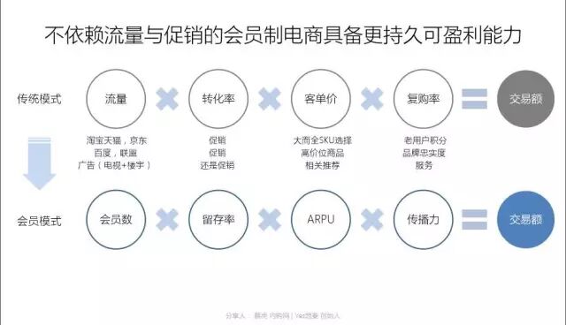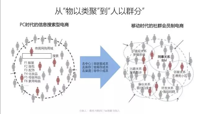 而移动时代,社群特征明显,以社群会员制为导向的电商模型则可以有效降低用户获取成本,甚至为零,还可以做到尽可能从用户需求点出发组织货品,所谓C2B,消除库存压力,也很可能不需要渠道,直接对接品牌,大幅降低渠道成本,甚至完全直销。