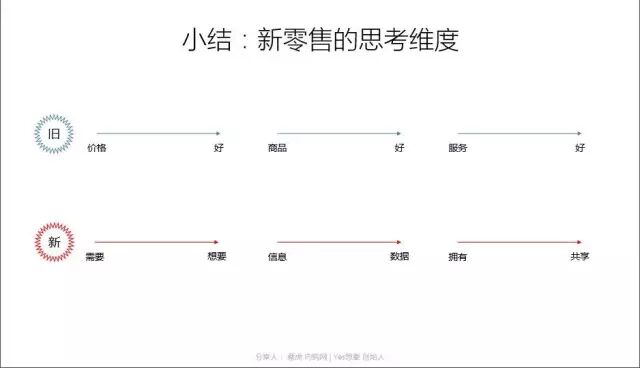 最后,小结一下我的思考与观点。传统模式的电商与传统零售其实是一样的,需要考虑三件核心事情:商品好不好、价格好不好、服务好不好。但新电商,或者更准确的说新零售,则需要思考怎么能够满足用户从需要到想要、从信息到数据,从一定让用户购买而拥有,变成用户共享的新路径。