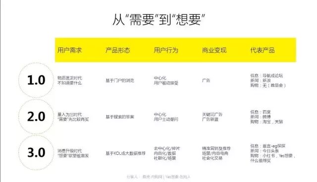 在由传统的PC时代到移动时代的过渡,购物按照从需要到想要的趋势的发展,“需要”时代,用户通过关键词搜索来表达,能提供答案的平台成为用户入口;而在“想要”时代,主逻辑是你有没有能力在用户表达“需要”之前,或者用户还没有意识到“需要”的时候,就发现并推荐他的“想要”,基于KOL或大数据的推荐机制成为主流,而用户行为也从搜索迅速转移到去中心、内容、社群化的碎片化场景,数据替代信息成为新的驱动力。