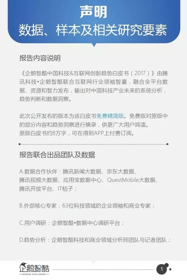 《企鹅智酷中国科技&互联网创新趋势白皮书(2017)》由腾讯科技•企鹅智酷联合63位互联网行业领袖与专家,融合全平台数据、资源和智力发布,输出对中国科技产业未来的系统分析,趋势判断和数据洞察。