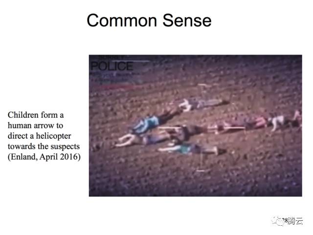 美国警察在空中追捕犯罪分子时,有一群小学生发现了犯罪分子的行踪,他们自动在地上,合作摆出了一个箭头的模样,指示空中直升机里的警察。这就是常识的魅力,机器人不能自动地识别谁是好人谁是坏人,他们也不会做出这样的反应。