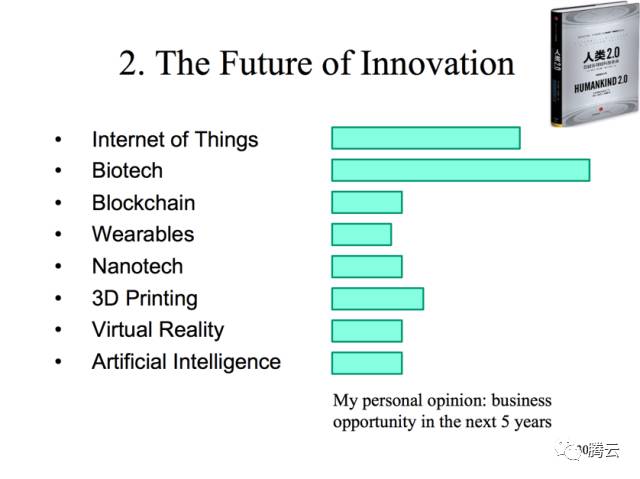 这个图左边列的是我认为与未来相关的科技领域,右边显示了我认为这些技术的颠覆性值。