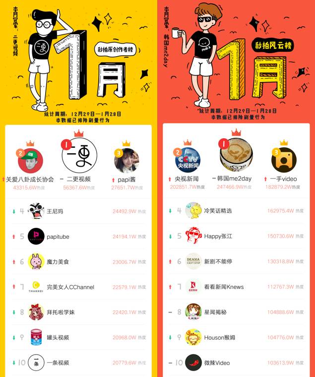 从原创榜单数据上可看出:“二更视频”延续了在短视频行业的领先势头,以月播放5.6亿稳居榜首;“关爱八卦成长协会”以月播放4.3亿位列第二;“papi酱”则以月播放2.8亿排名第三;而本次榜单中月播放量超过2亿次的创作者已有11人。在风云榜(内容为非原创)方面:“韩国me2day”以月播放24.7亿次蝉联冠军;“央视新闻”和“一手video”位列二三——足以见得“轻资讯”类视频的讨喜程度。