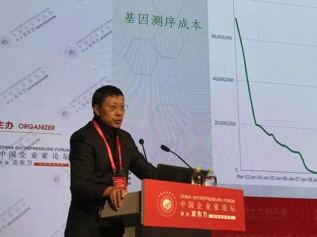 再给大家看一组非常重要且有意思的数据,即全球每一个领先行业排名第一的公司获得1亿用户所需的时间成本:无线电,38年;电信,11年;社交网络(PC时代),3年;移动互联网,1年;这个例子已充分说明,我们处在一个加速增长的时代。这种现象不仅仅发生在信息科技领域,也不仅仅是互联网范畴,我们看到,在生物科学领域里面,基因测序的成本过去十年从6万美金左右降到现在的几块美金,呈现出指数型下滑的曲线。