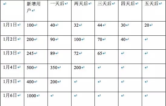 以此类推,1月3日获取的新用户有一个留存状况、1月4日5日···以后每天都有一个留存表格。把这些表格放在一起,就是一个巨大的斜对角矩阵: