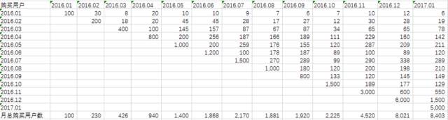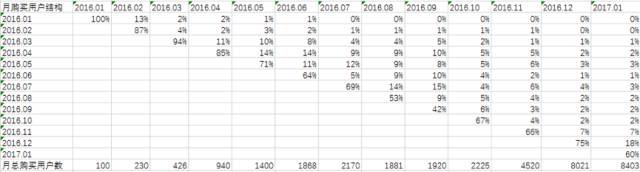 那么基于以上的方法论,我们现在就可以用它来分析一家互联网消费公司。(以下时间以月为维度,行为以购买为维度进行分析,金额是除去补贴后的净额。以下公司和数据纯属虚构,请不要对号入座。) 假设公司是一家互联网薯片公司,产品从16年1月开始在互联网上进行销售,公司正在进行A轮融资。 关于收入层面,我会问公司要以下3张表:购买用户、订单、销售额。如果公司无法提供的话,我会要求公司按照要求,跑一下数据,做成这个表格给我。难度应该不是很大,要不然互联网消费的“互联网”一词就成了伪命题。很多公司跑出数据后,自己也发现非常多意想不到的发现,直呼惊讶。 公司在16年1月有100个购买用户,下了170单,总共消费14,960元。这100个用户在2月有30个用户进行了购买,下了48单,消费4,176元。2月份新增200个购买用户,下了360单,消费28,080元。在2017年1月,一共有8,403个购买用户,其中5,000名是当月新增,其他是复购的老用户;下了15,970单,金额约173万,其中约70万是老用户复购,100万是当月新增用户消费。