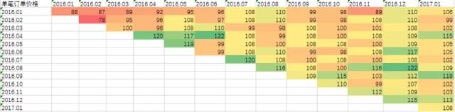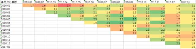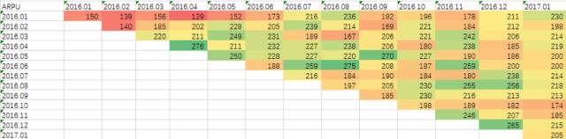 竖着看,可以看到当月的购买用户或者交易额中,由某个月获取的用户所做的贡献。以16年9月为例,购买用户中42%是当月第一次下单用户,58%是老用户。这42%的新用户只贡献了39%的交易额,而58%的老用户贡献了61%的交易额。这可能代表当月为了获取这些新用户,加大了补贴的力度,亦或是这些新用户的购买力(用户质量)偏低。再结合之前的留存分析,9月获取的用户留存维持在不错的水平,所以可能是由于对于老用户唤起做得比较好,导致老用户的购买贡献了较高的收入。 竖着看,我们发现3月的留存和10月留存明显比较差,原因可能是春节和国庆假期的影响,3月的留存差也可能是因为公司发展初期,数字不稳定。公司的业务可能存在明显的季节性。