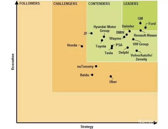 今年4月Navigant发表的无人驾驶研究报告显示,目前无人驾驶领域公司的前六名是:福特、通用、雷诺-日产、戴姆勒、大众集团、宝马。而谷歌、特斯拉和Uber分别位列第7、第12和第16。