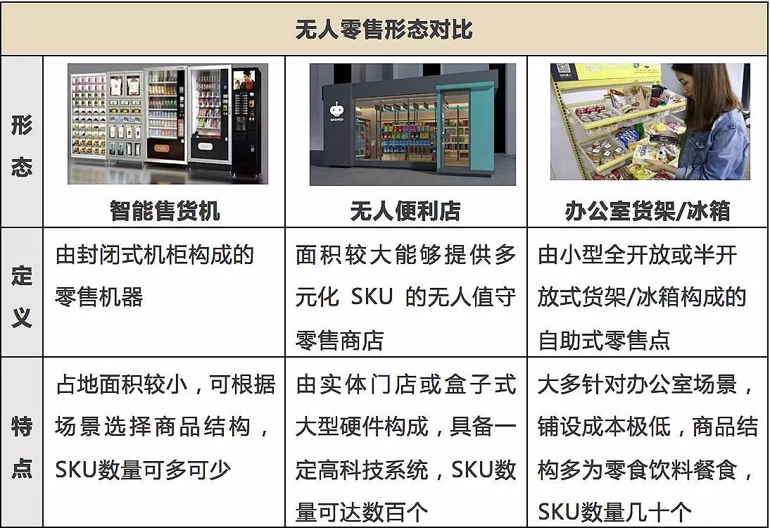 无人零售根据其设备开放的程度目前主要可分为三大类:全封闭式的智能售货机,大型半封闭式的无人便利店,以及开放式或小型半封闭式的货架/冰箱。