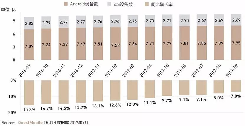 ▲ 2017 年 9 月中国移动互联网月度活跃设备数及增长率