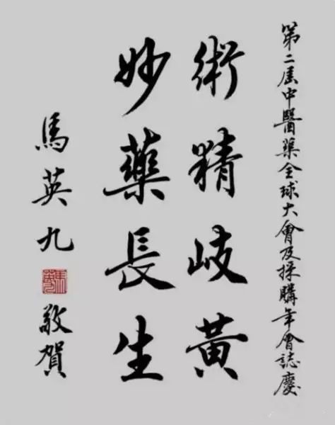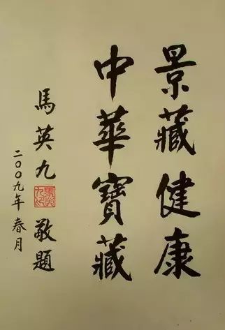 从书法的角度来说,马英九的字体正规规范,功底深厚,同时从字中看得出来马英九练习过的碑贴很多,比如欧体、柳体、兰亭等等。马英九为人诚恳忠诚,并不恃才傲物,在他的办公室里挂着一副对联“黄金非宝书为宝,万事皆空善不空”,是马家祖训。